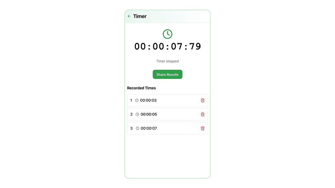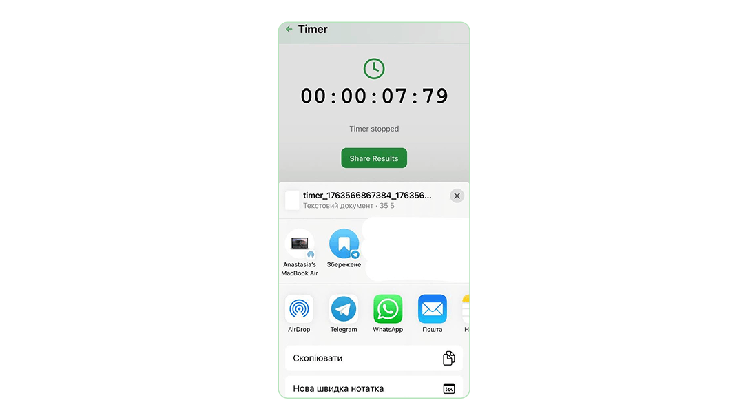 Послідовність: Застосунок автоматично створює послідовний список часу фінішу (наприклад, 25:01, 25:03, 25:03, 25:05), що відповідає порядку, у якому ви натискали кнопку.