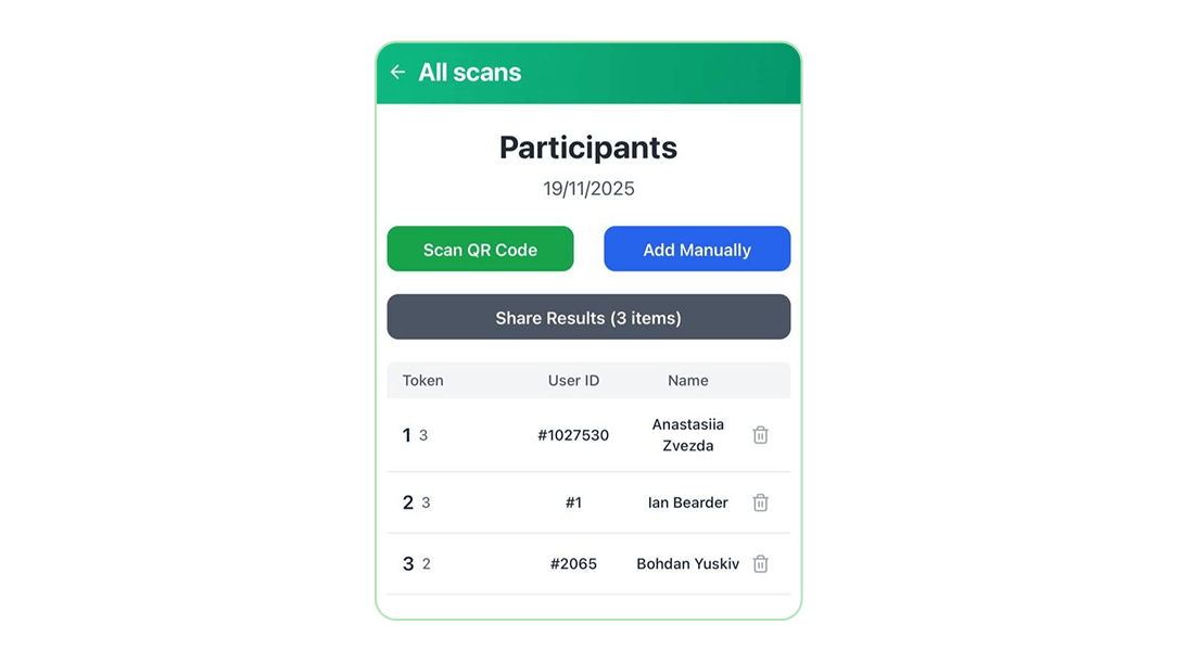 Крок 2: Сканування Учасника: Скануйте Особистий QR-код учасника. Це зберігає його унікальний ID.