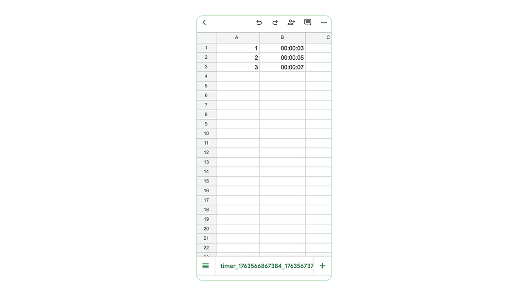 Дані Часу: Імпортуйте файл із часом (з пристрою Хронометриста) у Стовпець A електронної таблиці Google Sheets. Цей стовпець містить номер токену (наприклад, 1, 2, 3)